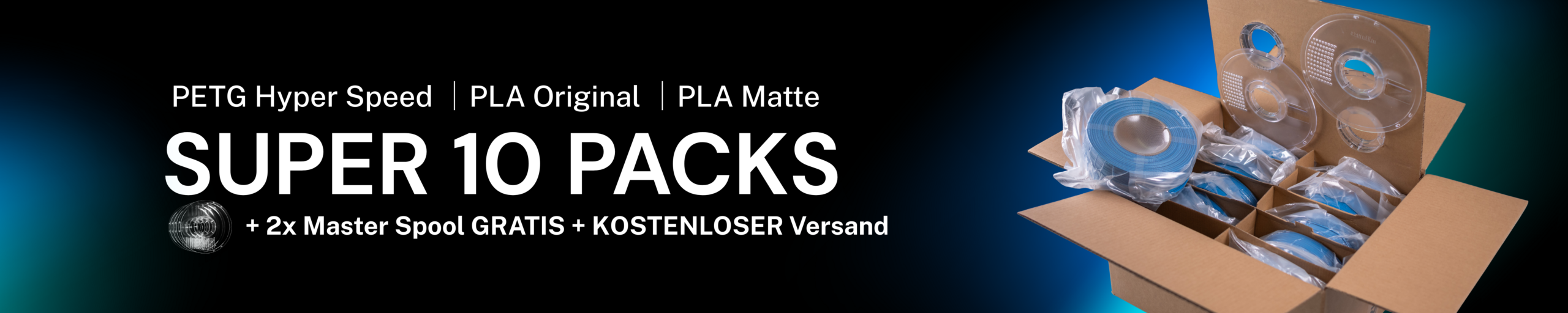 Lernen Sie die PETG Super Packs kennen. Jedes Paket enthält 10 kg unseres Refill PETG Hyper Speed Filaments und 2 GRATIS Master Spools. Entwickelt für Anwender, die zuverlässiges Hochgeschwindigkeitsfilament in größeren Mengen benötigen. Mehrere Farboptionen verfügbar.