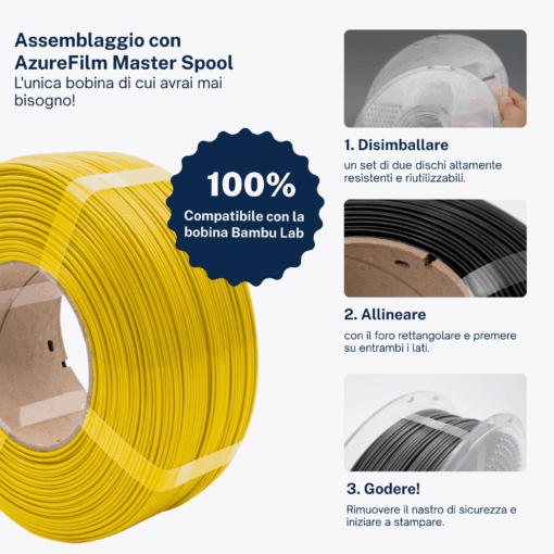 I nostri filamenti Refill PLA sono pienamente compatibili con AzureFilm Master Spool, l’unica bobina di cui avrete bisogno. Con questa bobina riutilizzabile, potrete unirti a noi per ridurre i rifiuti e ridurre l’impatto ambientale.